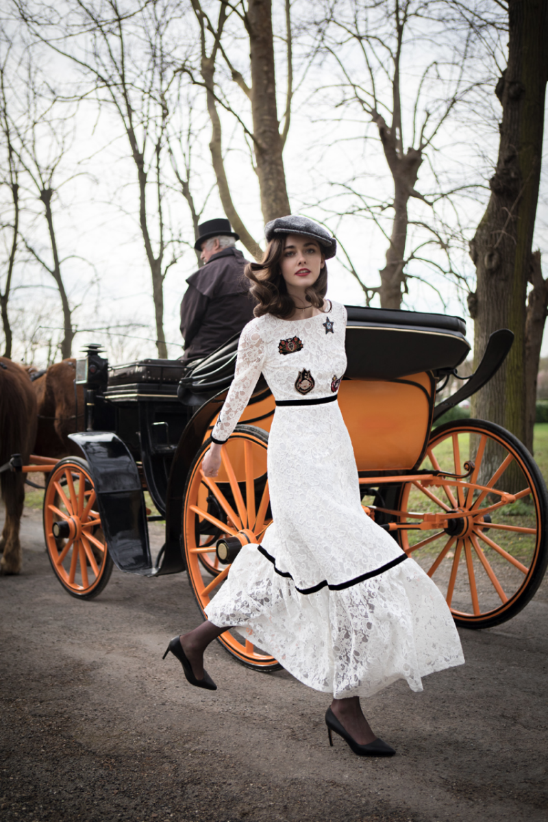 浪漫惬意的午后时光。城堡绿道旁,古董马车悠然停驻,时尚超模身穿nysense服装在城堡庄园漫步嬉戏,好一幅美丽的风景画。不禁让人沉浸其中。