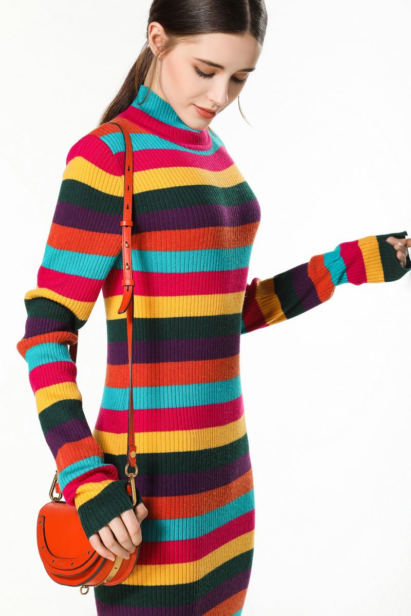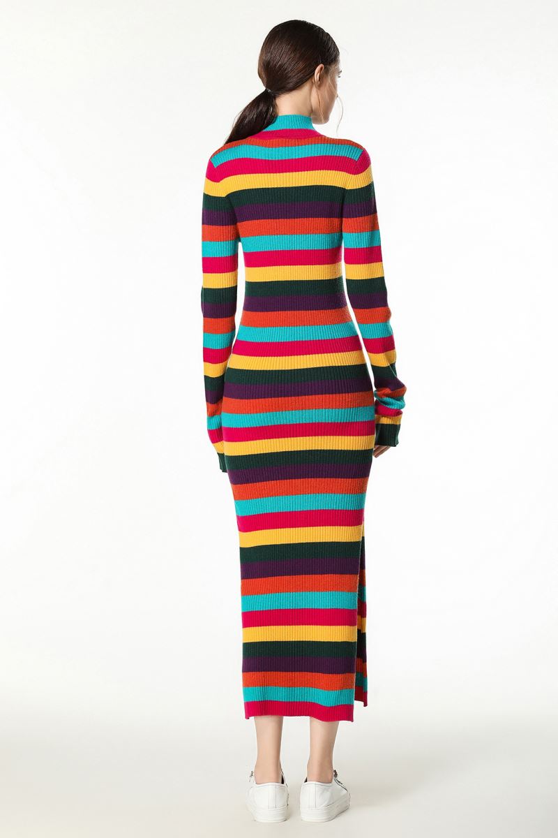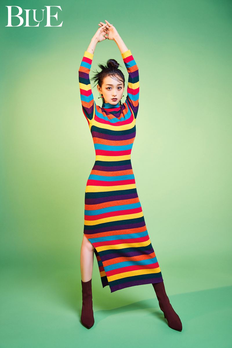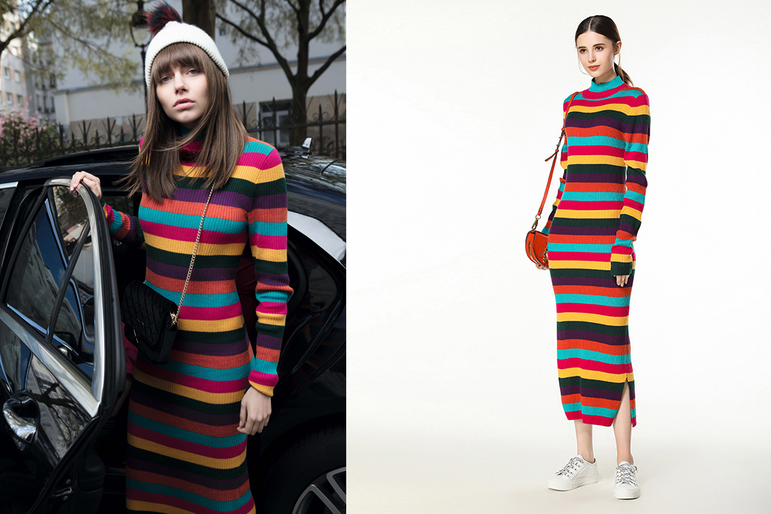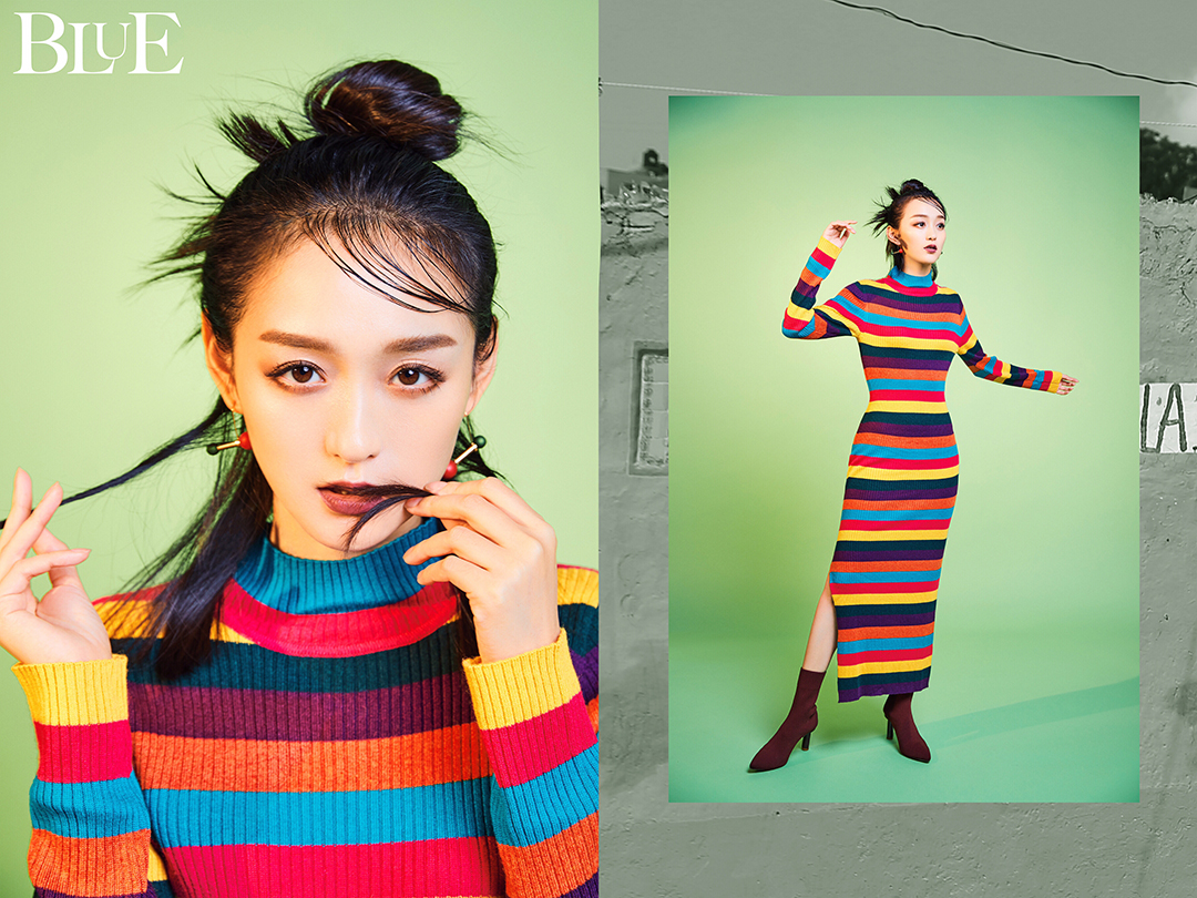 何泓姗身着的光感条纹系列针织连衣裙,色彩与色彩之间的组合碰撞,夺目耀眼。半扎的丸子头更显干净利落,脚踩高跟袜靴更是将女性活力有型的韵味释放的淋漓尽