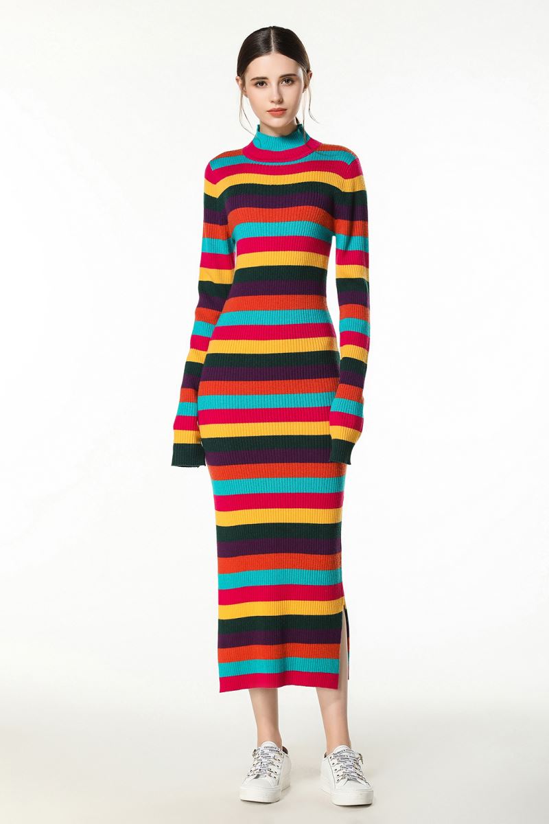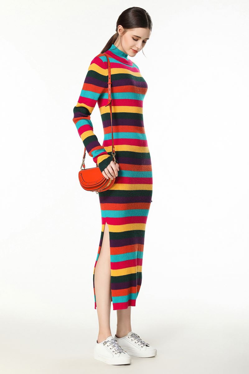 面料手感柔滑富有弹性,大大地增加服装的包容性,裙摆侧边开衩的处理则增添女性妩媚的姿态,